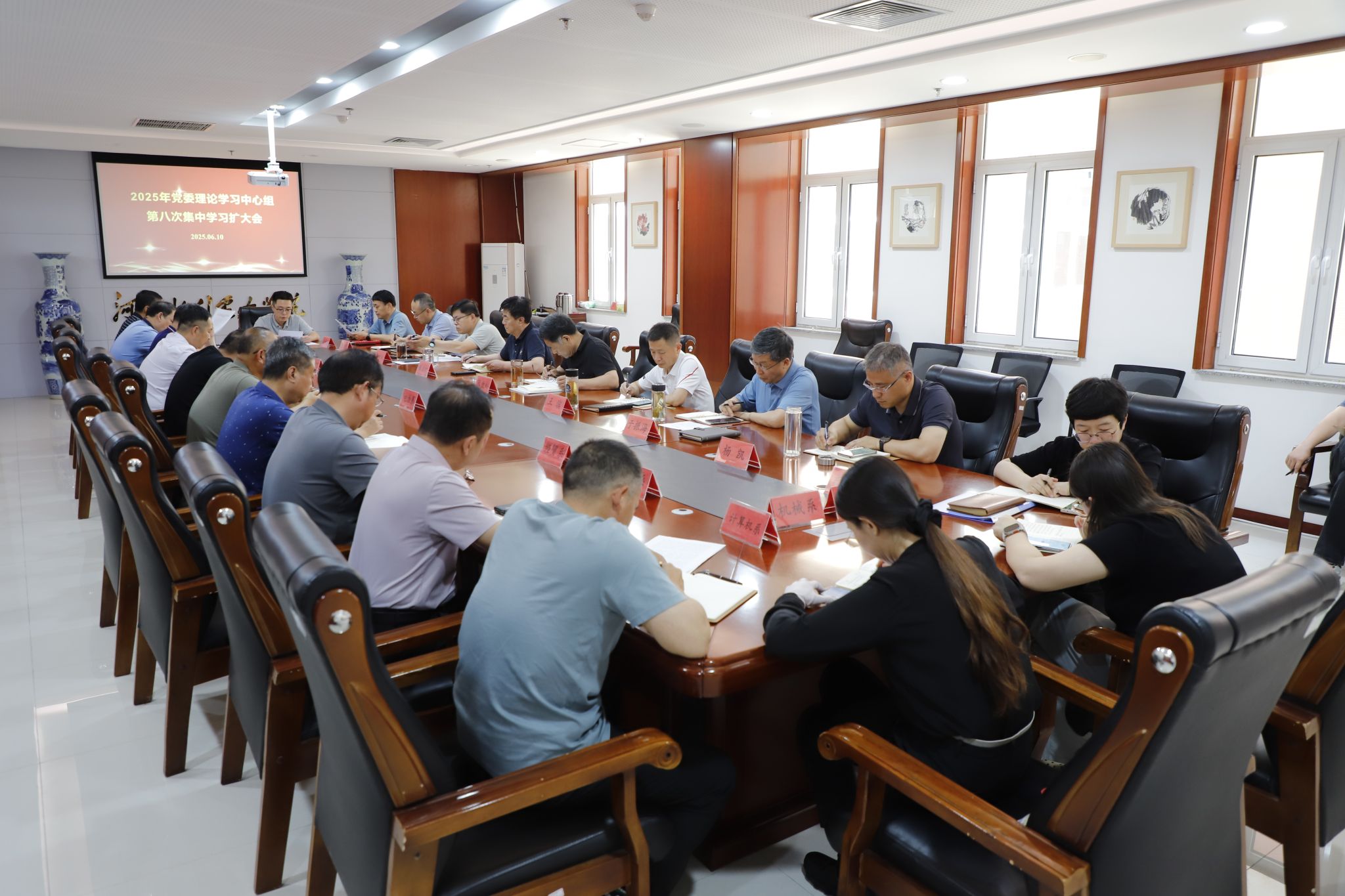 6月10日下午,我校召开2025年党委理论学习中心组第八次集中学习扩大会,认真学习习近平总书记在河南考察时的重要讲话、《党政机关厉行节约反对浪费条例》等内容。校领导班子成员出席会议,党委书记张效松主持会议并讲话。张效松指出,新修订的《党政机关厉行节约反对浪费条例》将“领导干部带头践行节约”明确为政治号令,将“过紧日子”的要求转化为可操作的制度约束,旨在弘扬艰苦奋斗、勤俭节约的优良作风,对于深入贯彻中央八项规定精神、...