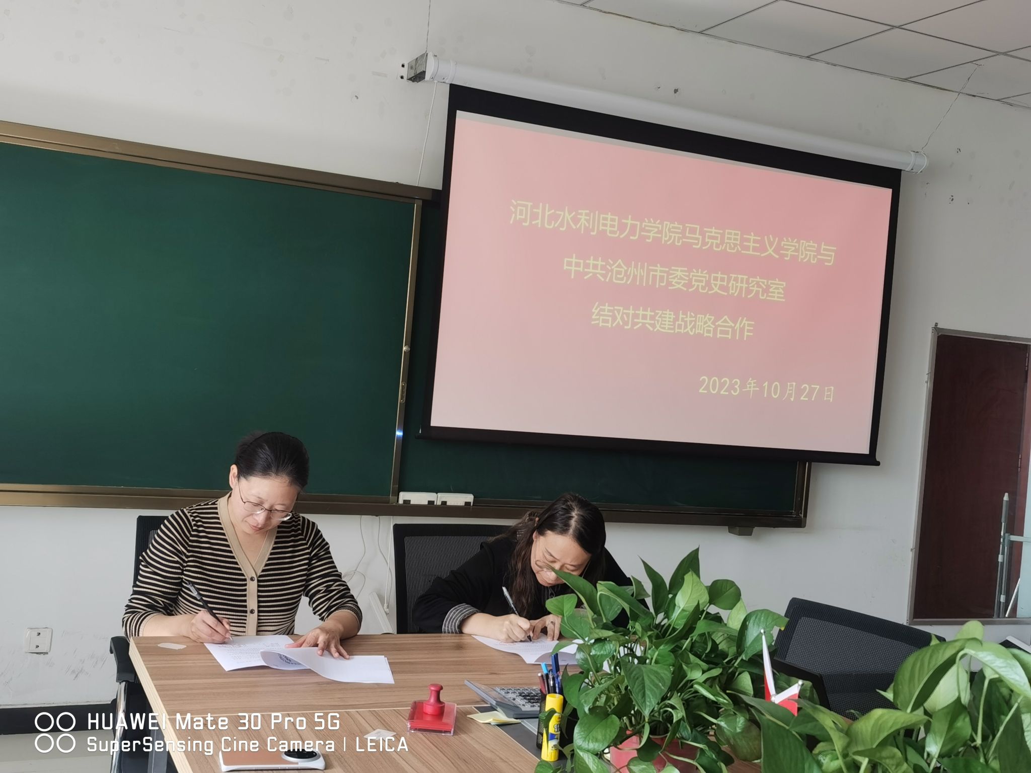 10月27日下午,中共沧州市委党史研究室代表莅临我校参加马克思主义学院与中共沧州市委党史研究室开展结对共建签约仪式,院长贾启红,副院长崔政代表马克思主义学院参加了本次签约仪式。结对共建本着践行习近平新时代中国特色社会主义思想,全面贯彻落实中宣部、教育部等十部门关于印发《全面推进“大思政课”建设的工作方案》要求,通过友好协商,以“优势互补,互利共赢、着眼长远、共同发展”的原则,推进实践教学、党史教育、理论研究和学科建设等方面深度融合及精准共建,...