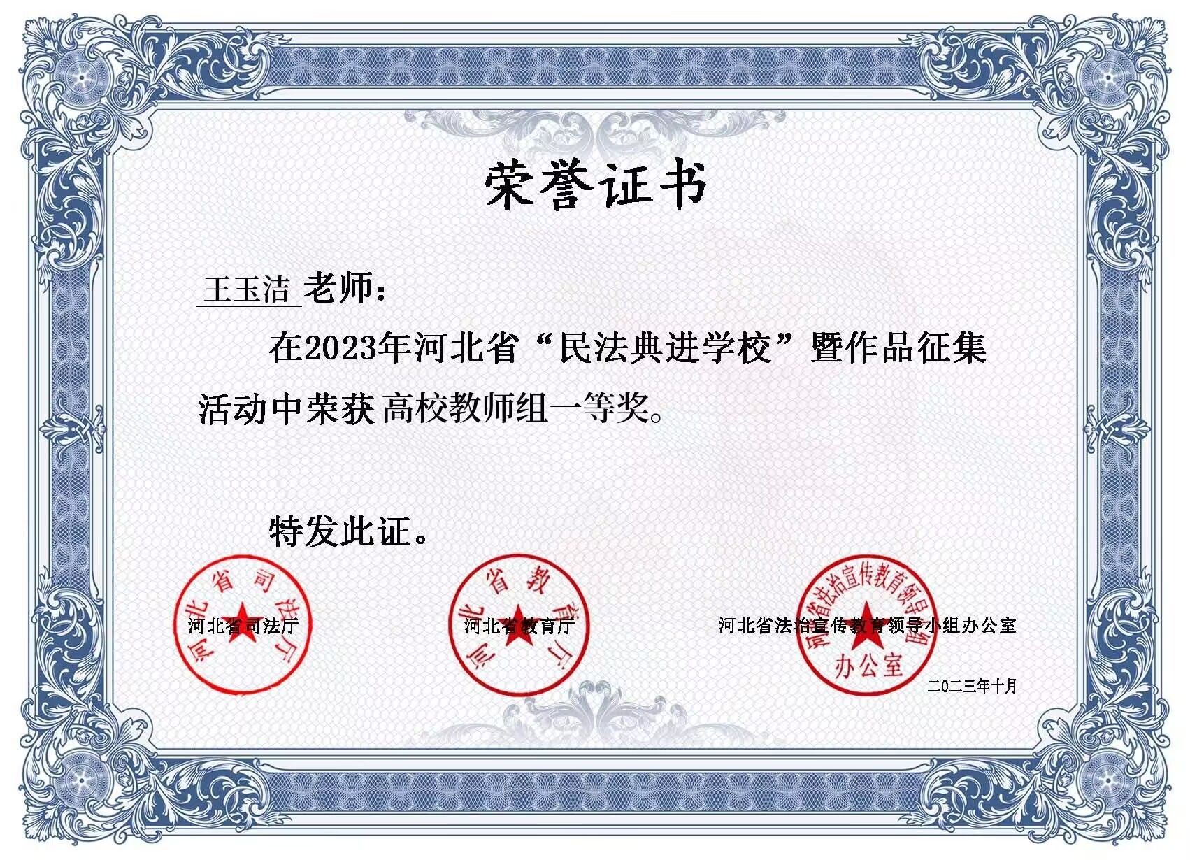 法与时转则治,治与世宜则有功。为深入学习贯彻习近平法治思想,深化民法典学习宣传,加强青少年民法典教育,引导学院广大师生学深、学懂、学透民法典精神,按照2023年“美好生活·民法典相伴”主题宣传活动要求和“每月一主题”普法宣传活动安排,2023年6月至8月,我校按照省司法厅、省教育厅、省法治宣传教育领导小组办公室要求组织开展了“民法典进学校”暨作品征集活动。通过层层评选,我校王玉洁老师和土木系郑喜同学于9月28日参加河北省“民法典进学校”活动,并分别荣获“省级高校教师组一等奖”、“省级高校组三等奖”的好成绩。