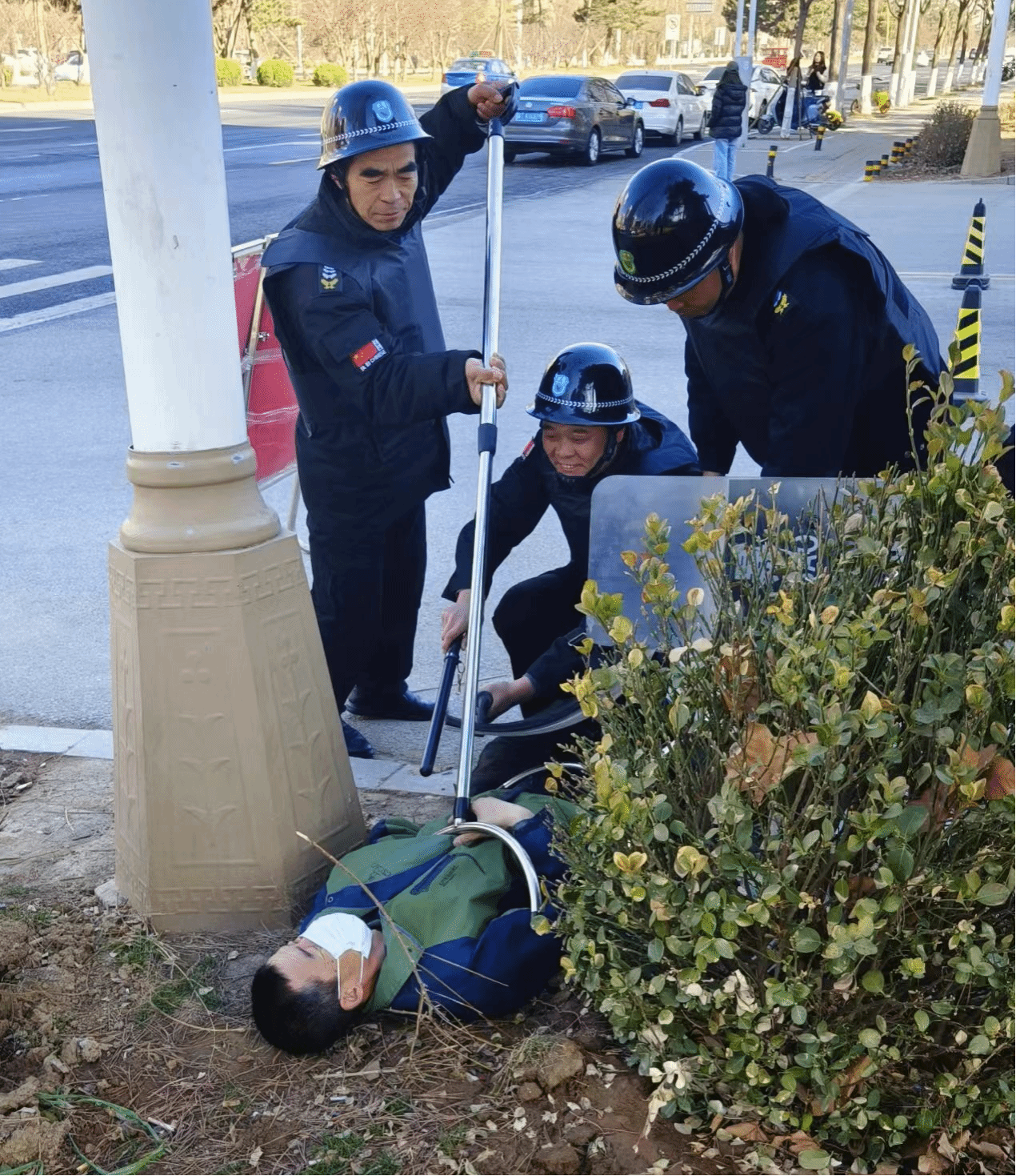 演练开始时,一名由保安员扮演的“可疑人员”想进入校园未果,持械强行闯入,值班保安员立即报告总指挥,总指挥下达启动应急预案,应急分队收到后携带防暴工具赶赴现场,手握防暴盾、钢叉上前挡住“歹徒”,大家齐心协力把“歹徒”逼退至大门外草坪,“歹徒”被钢叉叉得不能动弹,“歹徒”手中的凶器随即被夺下,最终被制服。