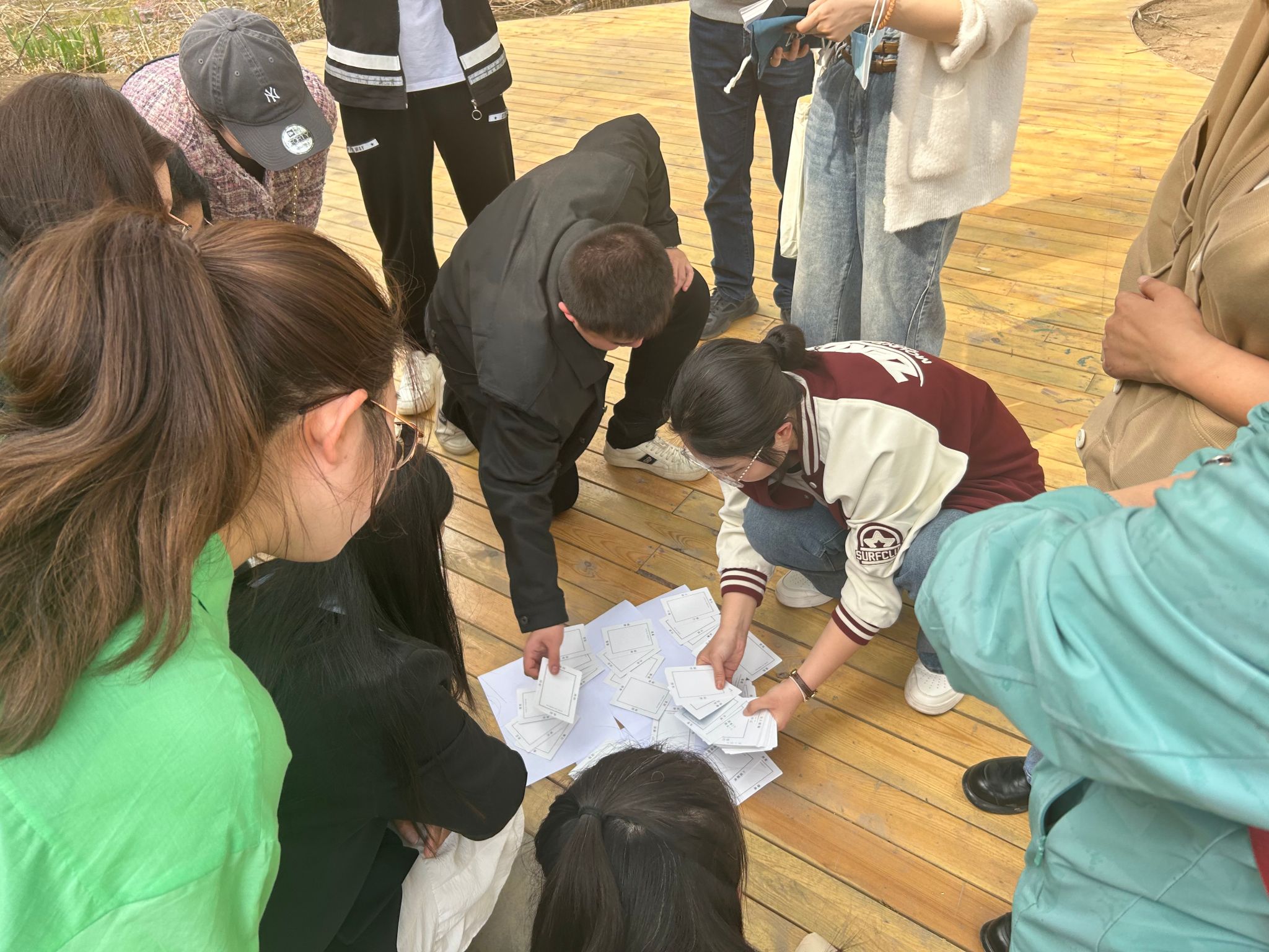 为进一步增强心理健康教师与辅导员的联动力量,提升育人合力,本学期学工部在一线辅导员中选任5名兼职心理健康教师,形成辐射各系、专兼职相结合的20名心理健康教师团队。此次活动由学工部副部长路鹏主持,心理健康教育中心王佳慧负责技术展示,全体心理健康教师在大自然中体验沉浸式“团体辅导”。在活动之初,王佳慧老师向老师们介绍了团体辅导的基本内涵、功能、类型、准备及操作流程等内容,并结合我校学生成长性团体辅导的案例,剖析团体辅导技术科学要义。在老师们了解团体辅导理论知识后,开始了亲身体验团建活动。活动伊始,王佳慧老师和团体成员共同确立团体契约,要求全身心体验活动,排除外界干扰、包容接纳彼此、不攻击不指责等。在热身活动中,王老师带领团体成员进行第一个热身活动——“如果我是…”,引导成员们舒张身体,让心慢慢静下来,体察自身状态,观察、感知并与所处环境产生链接,选取环境中的任何物品来代表自己,经过沉静、体悟后,成员们分别用麻雀、树叶、树枝、高楼、游客、湖水等代表自己,并表达自己当下的感受。在初步适应环境,尝试自我体悟之后,进入了第二个活动——“潜意识投射卡”,成员们先是从繁多的文字卡中挑选出了平静、自由、舒服、安心、相信、外向、子女等与自己最为契合的主题词,体察所选主题词带来的情绪体验,抓住思绪的流动;随后根据主题词进行图画卡的选择,文字卡与图画卡的结合,一个个幸福、自由、安心、子女的背后故事逐渐涌现,老师们在放松的氛围下逐渐打开自我,展现出了内心的平衡状态,不断体察、觉知并接纳自我。