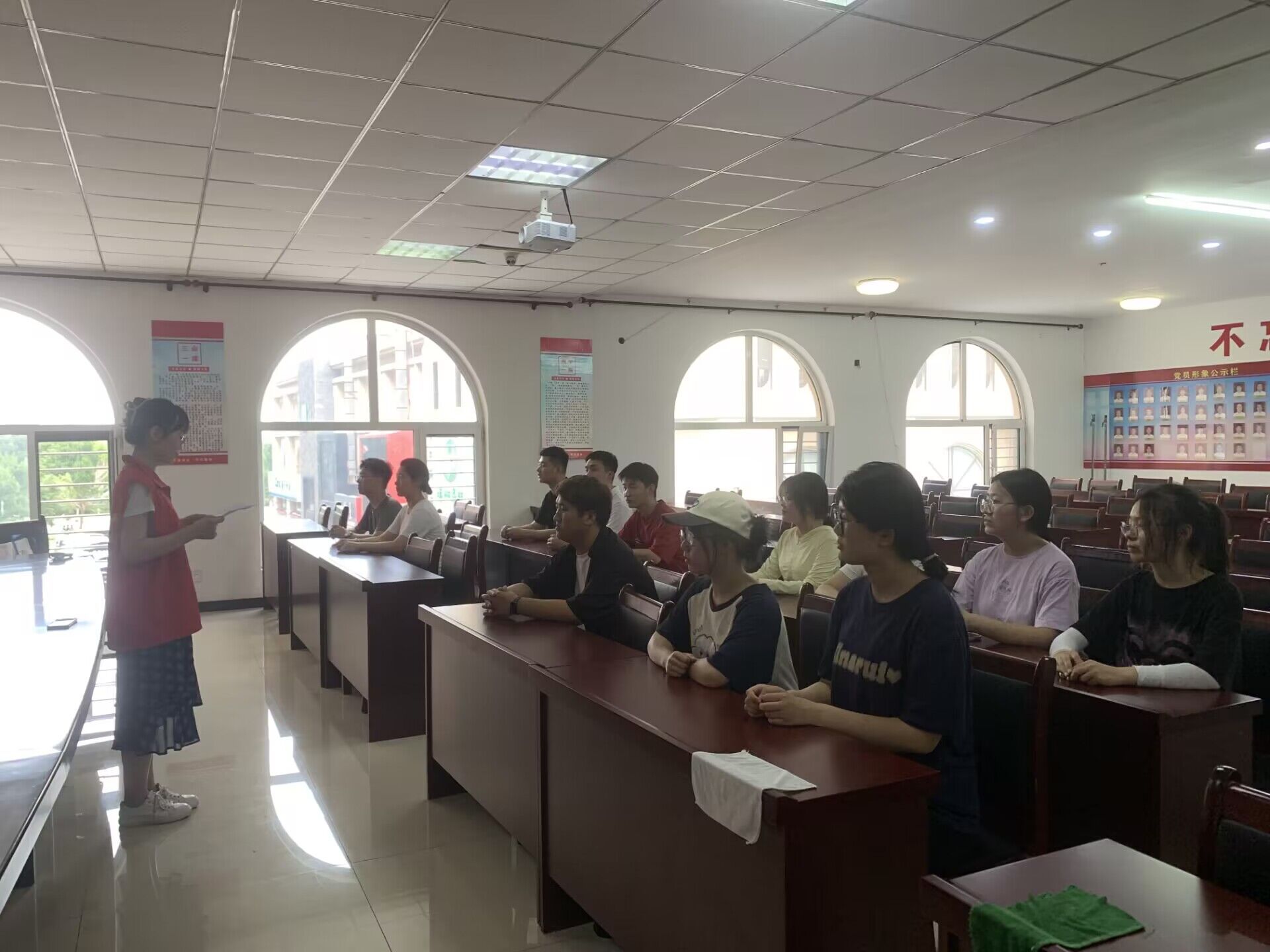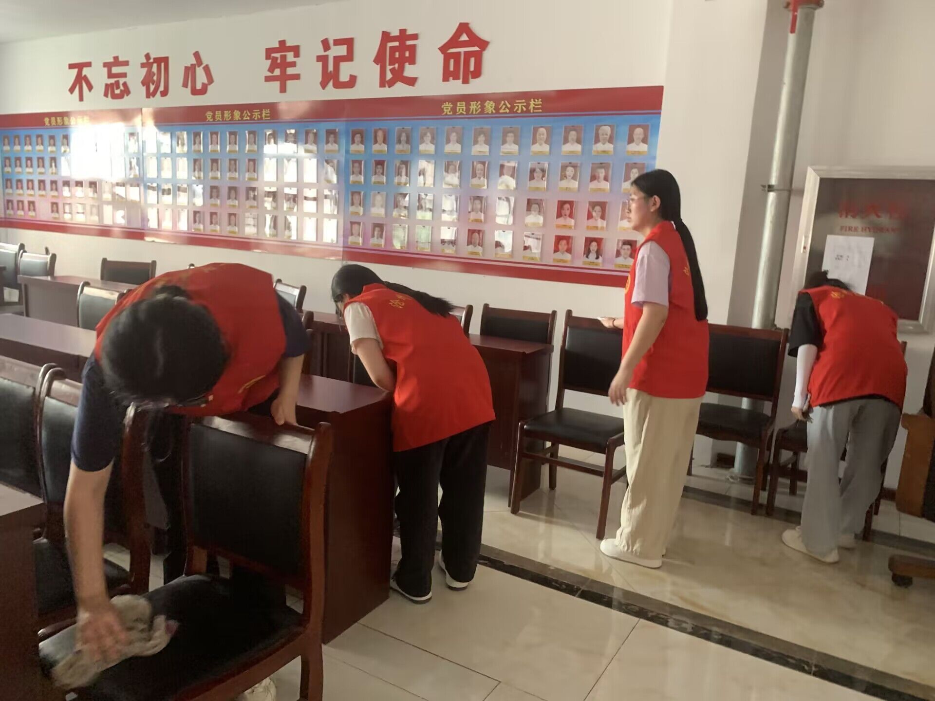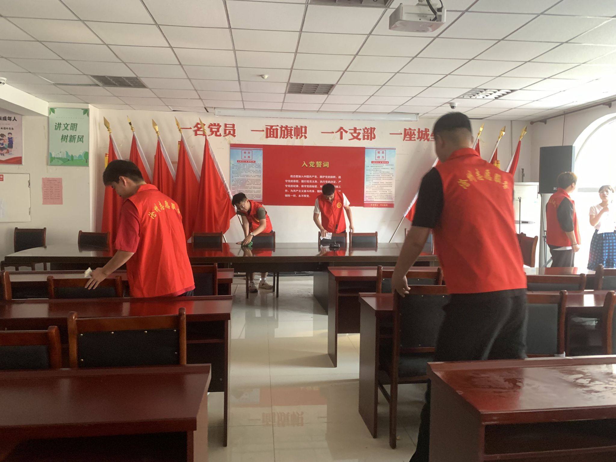 在大季屯新时代文明实践站,王馨平首先围绕志愿精神进行宣讲,她以丰富的实践经验和深入浅出的语言,阐述了志愿服务的意义和价值,鼓励大家积极参与志愿服务活动,为社会贡献自己的力量。随后党员志愿者们身穿红色马甲,分工明确开始打扫工作,有的负责擦拭桌椅,有的负责清理地面,还有的负责整理会议室物品。经过大家的共同努力,会议室面貌焕然一新。