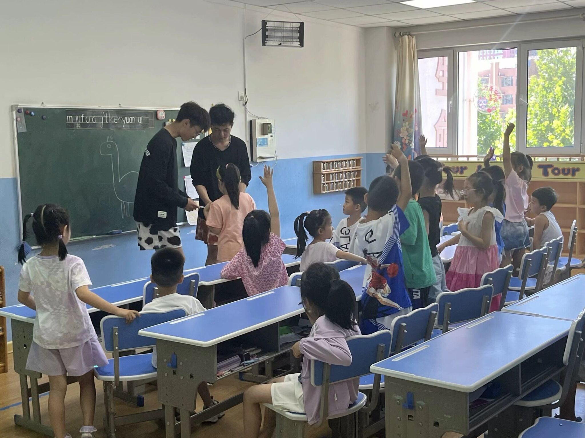 仪式结束后,在王园长的引领下,14名学生代表分别进入不同教室开展各式各样的实践活动,同学们通过生动的故事讲述、欢乐的互动游戏、有趣的手工制作、奇幻的物理科普、美妙的歌舞表演等形式同小朋友们一起互动,既增进了情感交流,又锻炼了同学们的组织协调能力。