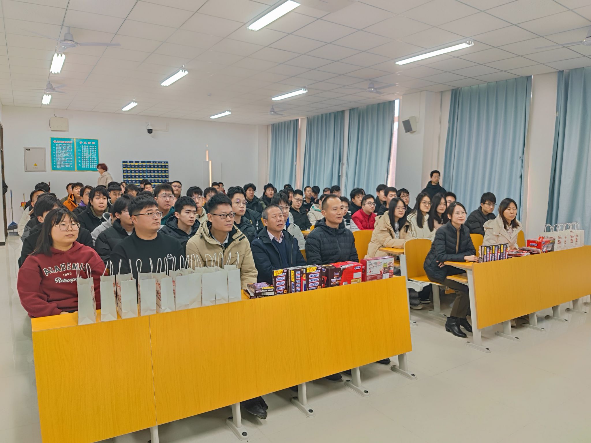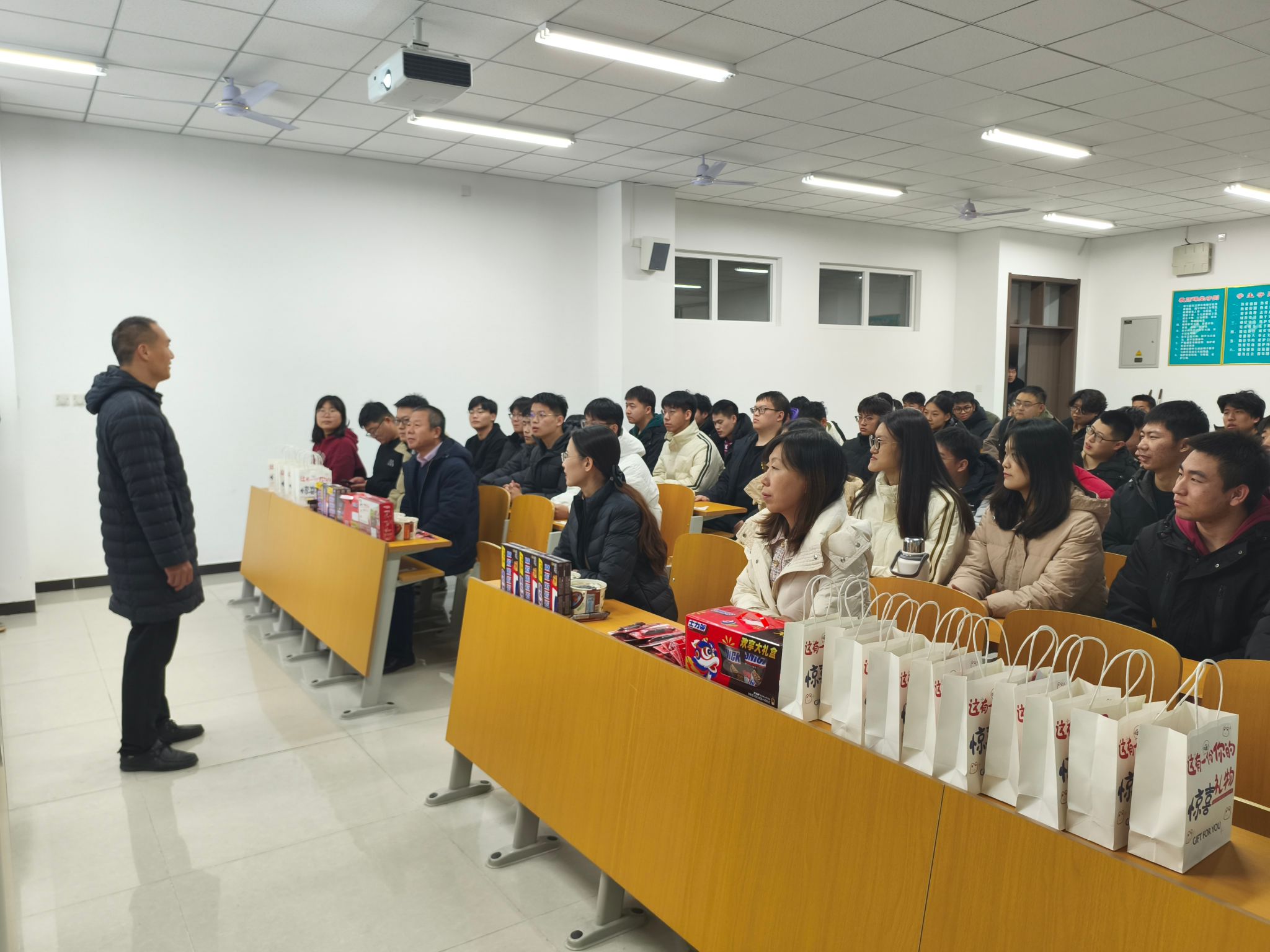 活动当天,老师们为考研学子送上精心准备的慰问礼包。礼包内不仅有考研文具,还有巧克力、士力架、咖啡等能量补充食品,象征着为同学们的考研之路提供“能量补给”;此外,现场还播放了上一届学长学姐送来的祝福视频,让学生们在寒冷的冬日感受到了浓浓暖意。