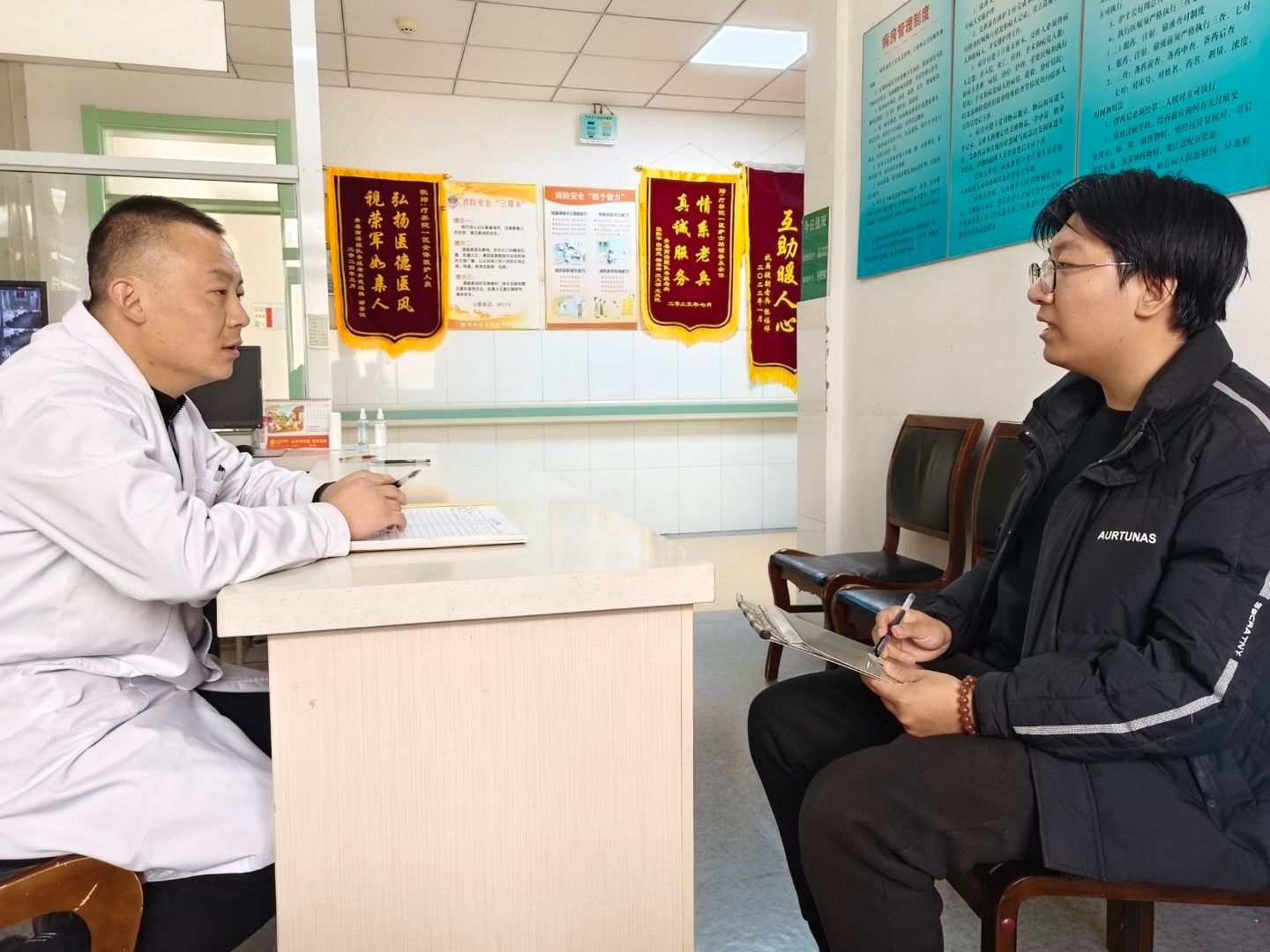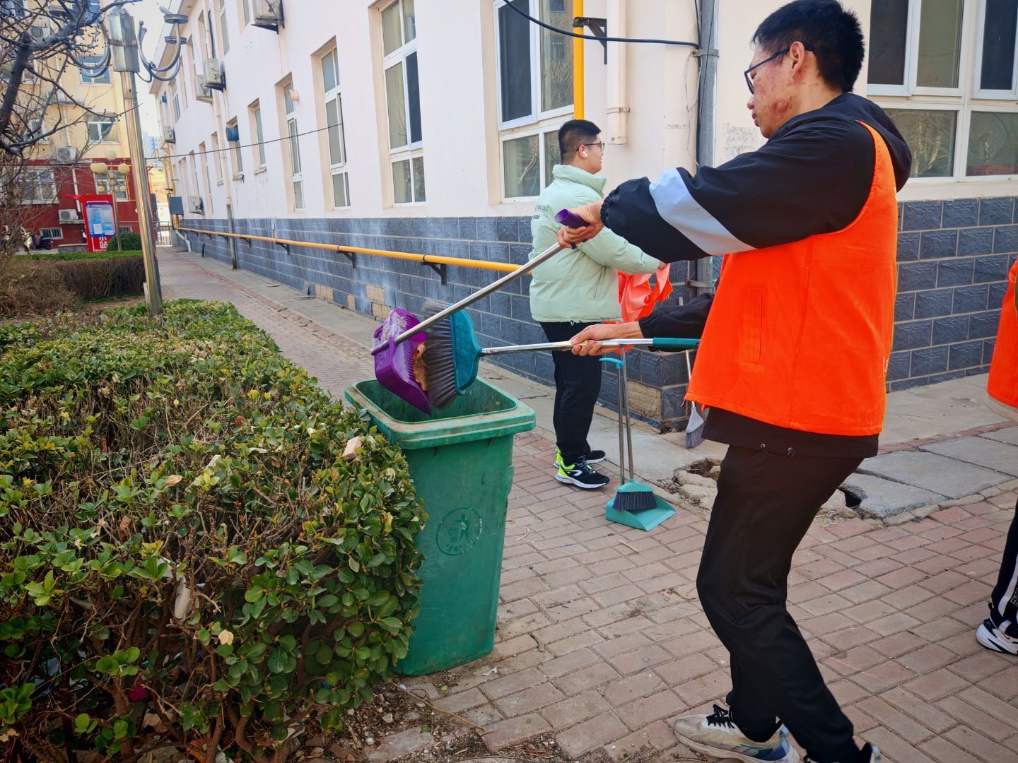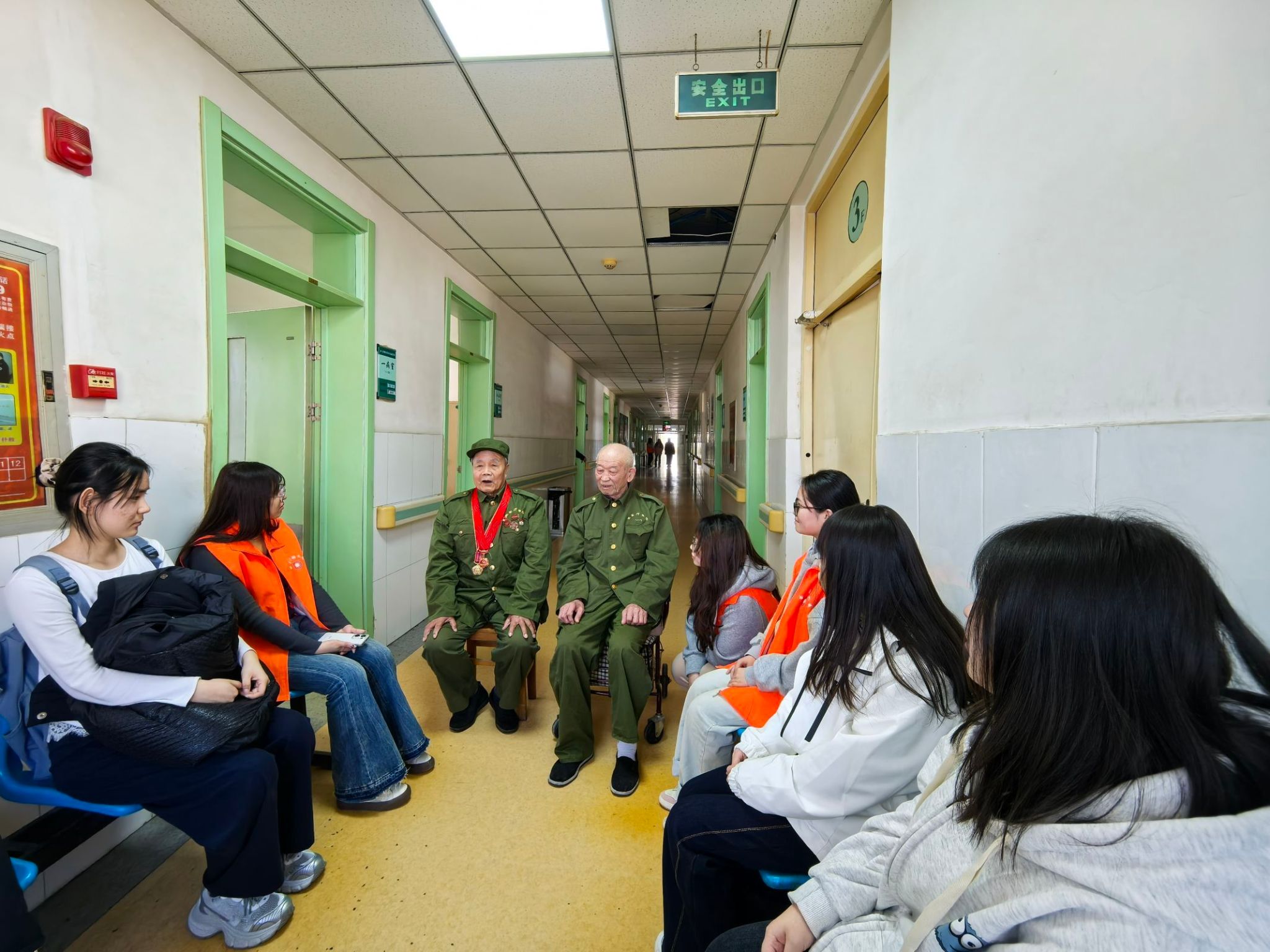 在荣军院,同学们通过与医护人员交流,了解了老兵们在荣军院的生活状况,并手持清洁工具,细致清扫庭院落叶、整理康复器械、规范车辆停放,为老人们营造了舒心、整洁的生活环境。服务过程中,志愿者们特别注重与革命前辈的情感交流,通过聆听抗战老兵讲述烽火岁月、观看泛黄军功章背后的故事,深刻体悟到革命精神的时代价值。